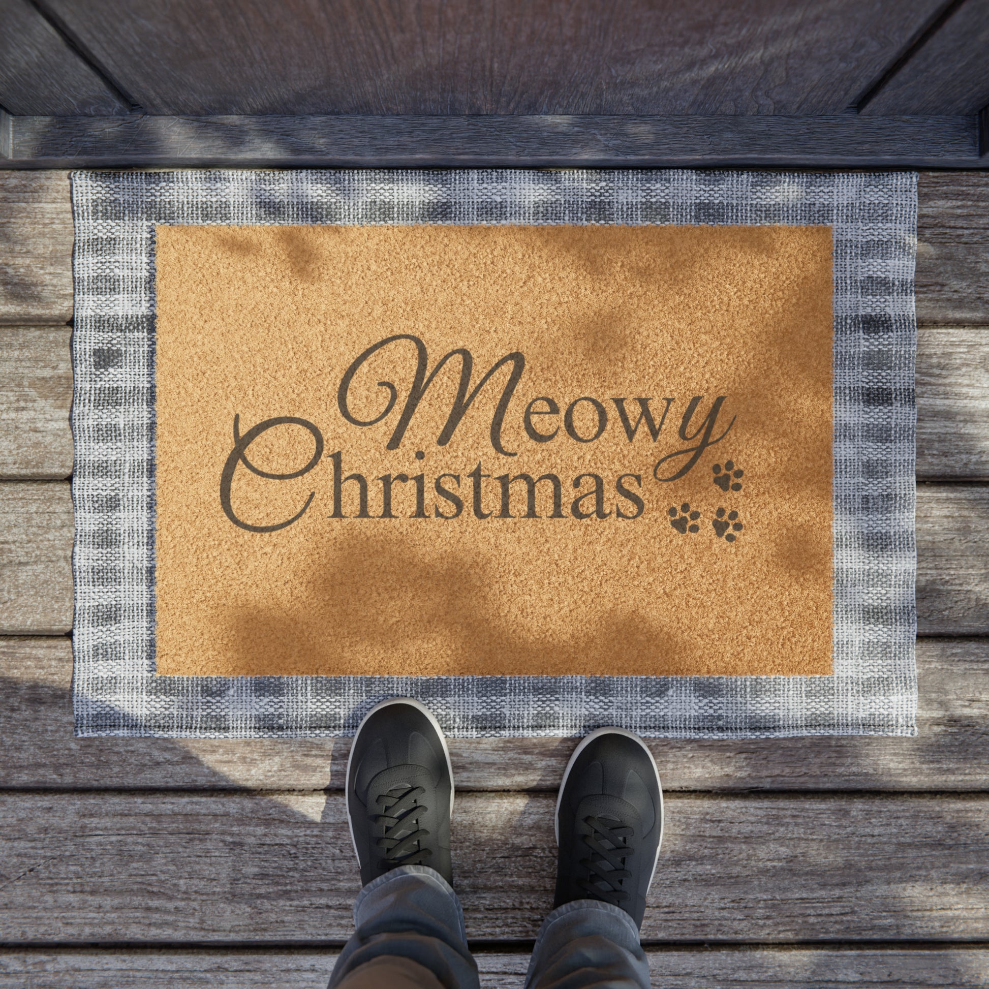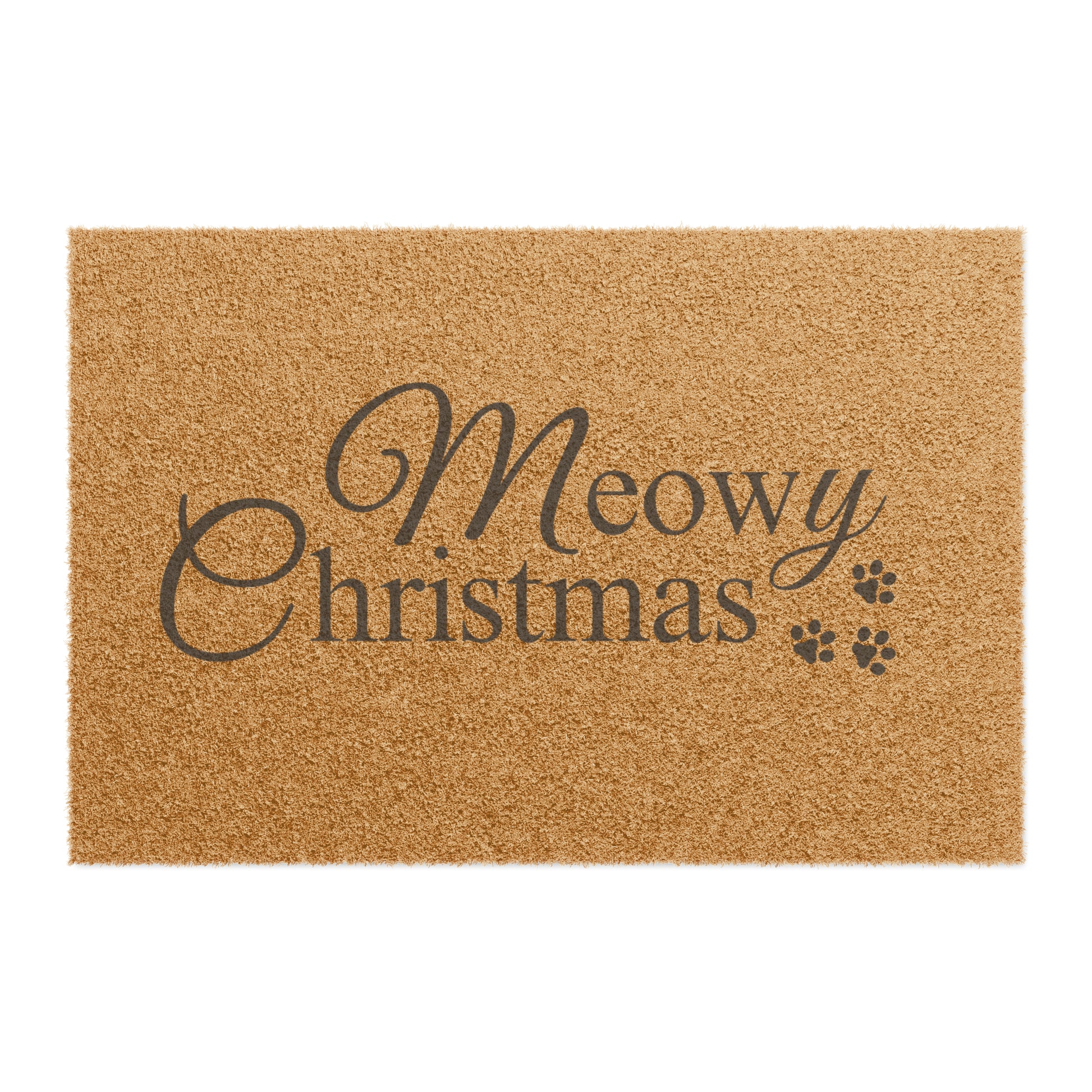 Introducing our Meowy Christmas Doormat – a purr-fect 24" x 16" outdoor accessory made from Grade A tufted coir coconut fiber. The black vinyl backing adds stability, ensuring a meow-gical entrance experience for guests. Assembled in the USA from globally sourced parts, this festive mat is the cat's meow for spreading holiday cheer. Step into your meow-velous abode with our Meowy Christmas Doormat, where every visit is a paw-sitively delightful affair!