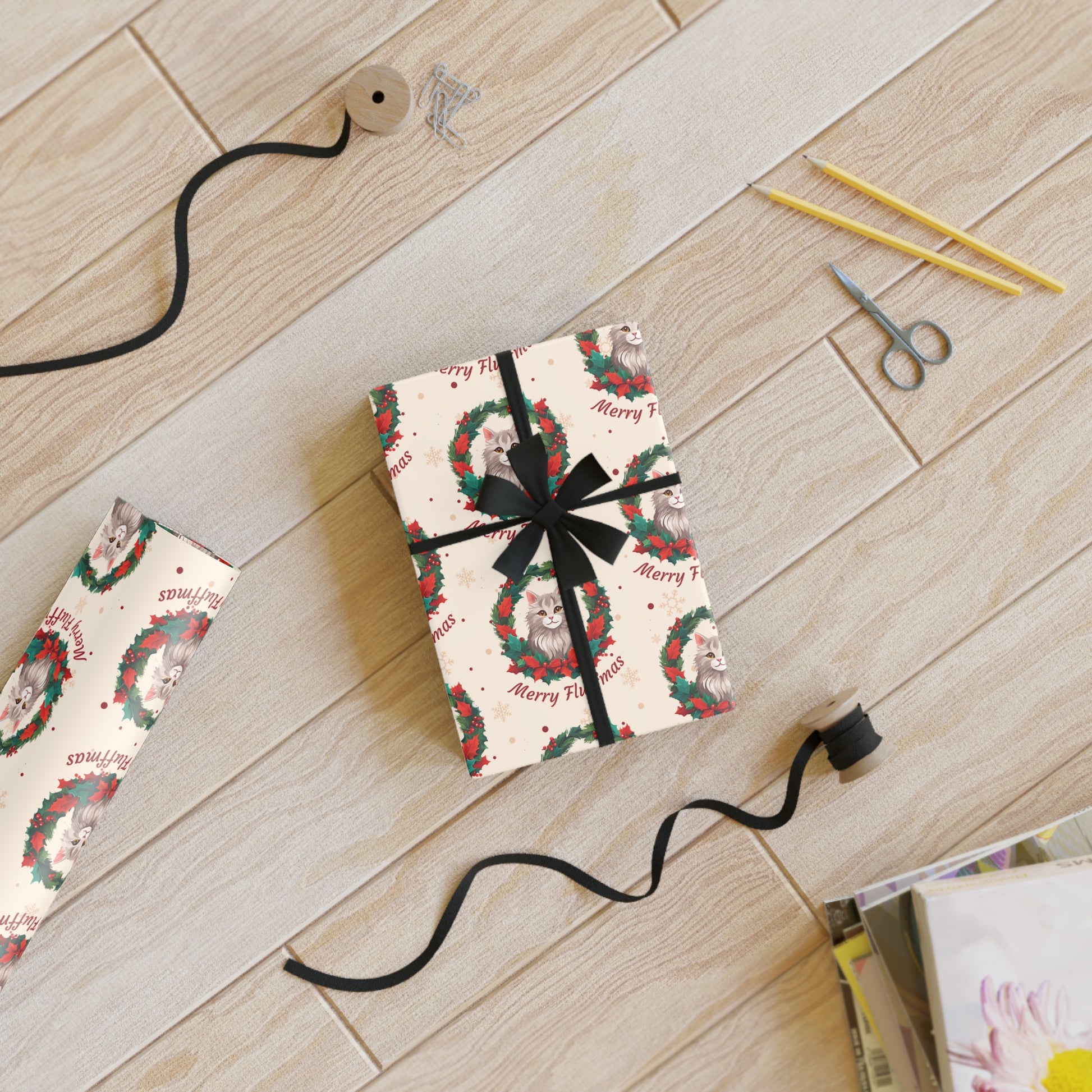 Get ready to unwrap some holiday cheer with our adorable Merry Fluffmas Cat wrapping paper! Featuring a curious kitty peeking out from a festive wreath, this paper is sure to delight cat lovers of all ages. Made from high-quality, sustainable materials, it's the perfect way to wrap up gifts for your furry friends and human loved ones alike.