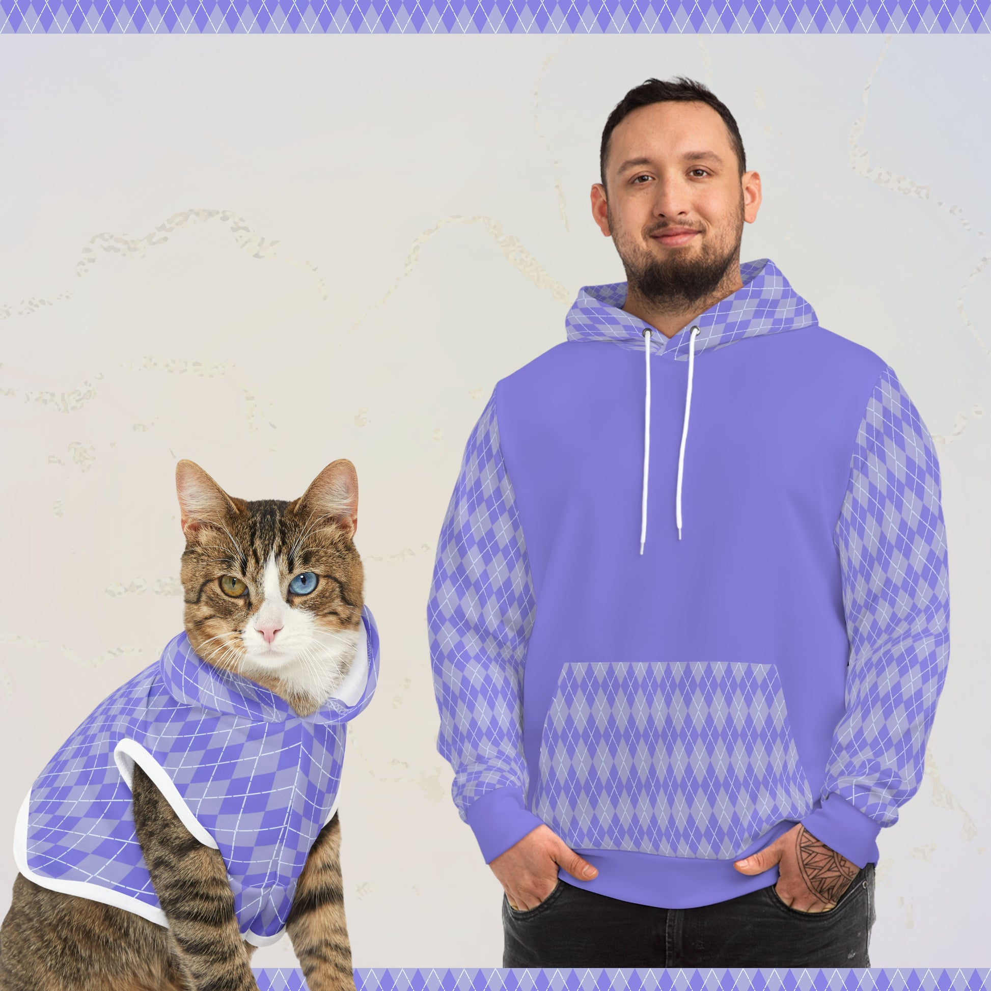 Introducing our Periwinkle Dreams Hoodie Bundle – a stylish unisex hoodie with a Periwinkle argyle pattern, paired with a matching pet hoodie. Elevate your casual look with this coordinated set, offering comfort and flair for both you and your furry friend!