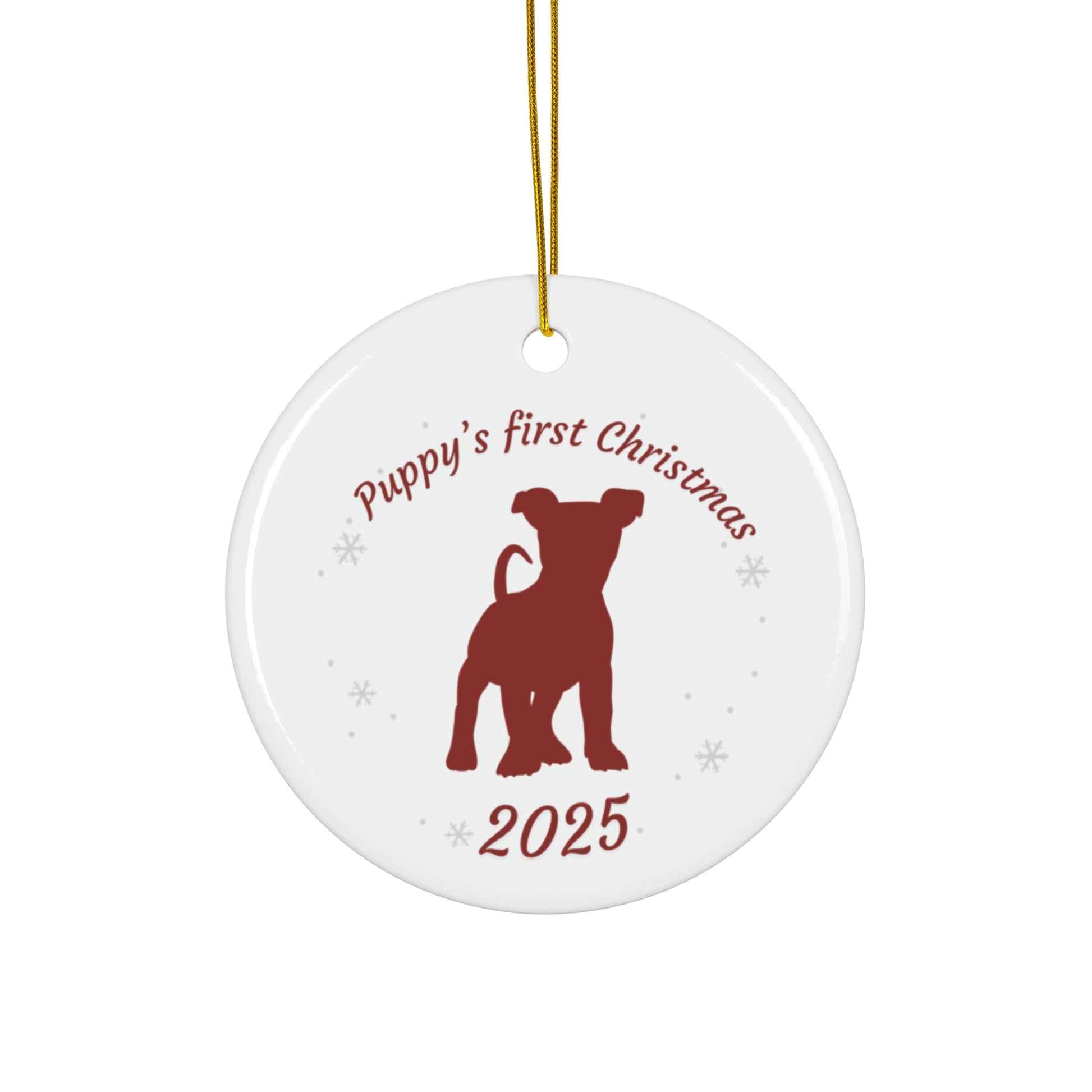 Celebrate your puppy's first Christmas with our ceramic ornament. Made from high-quality 0.125" (3mm) thick ceramic, it has a glossy finish and is available in four shapes: Snowflake, Star, Heart, and Circle. With a one-sided print, it includes a hole and a gold-toned hanging string. Perfect for commemorating your furry friend's first holiday season.