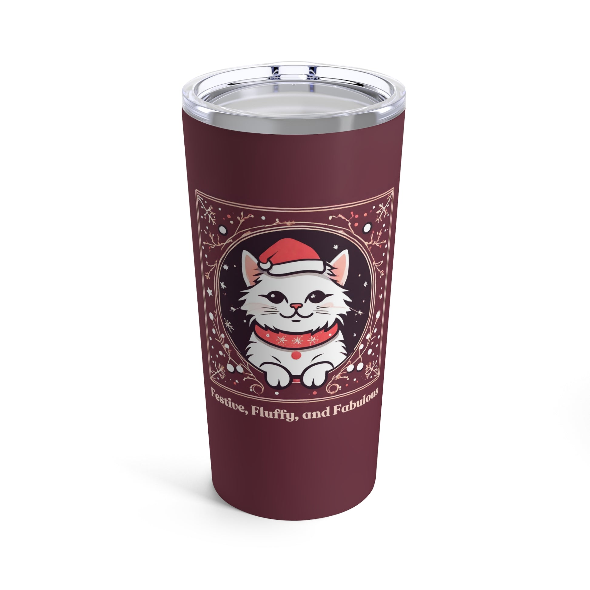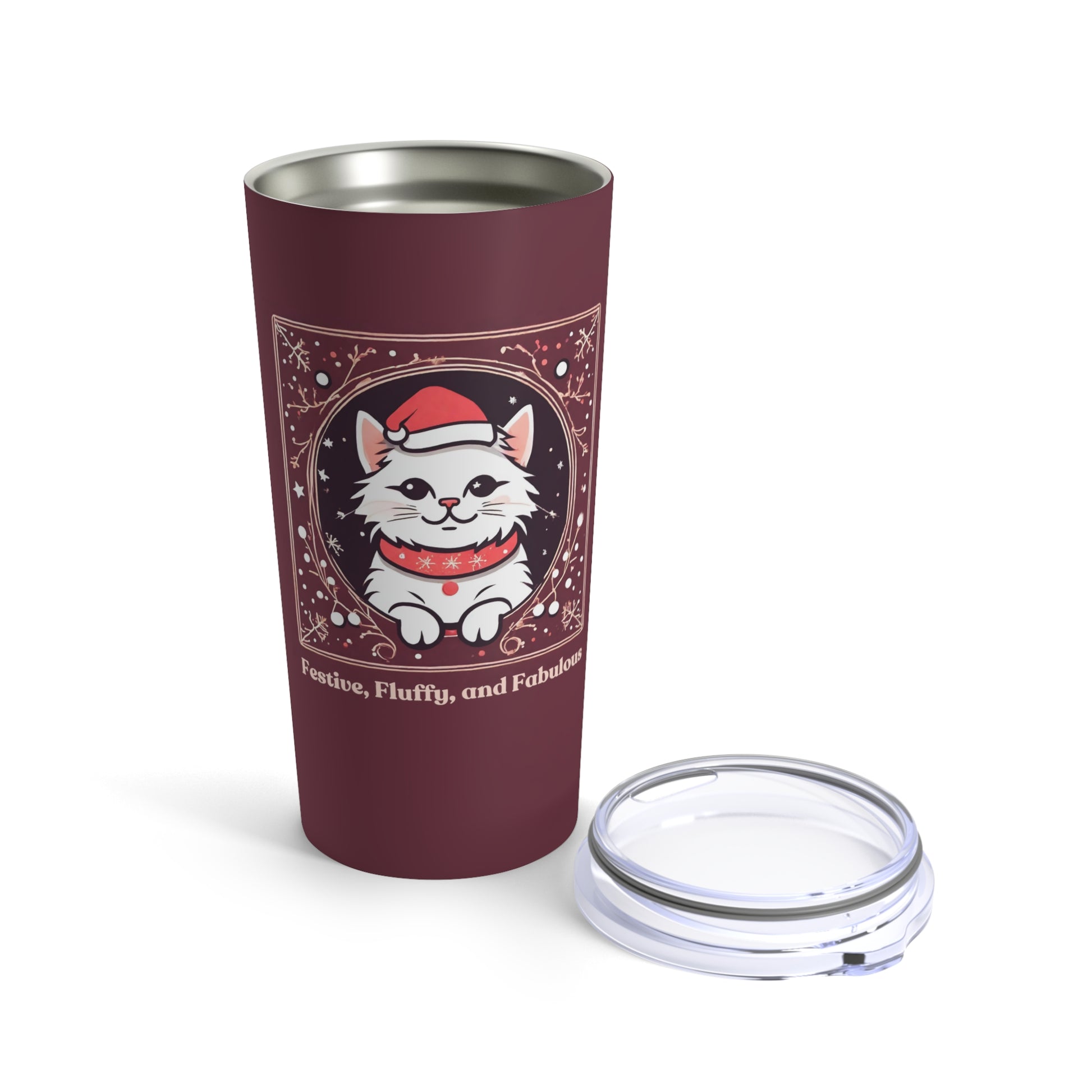 Introducing the purr-fect accessory for cat enthusiasts on the move—the "Festive, Fluffy, and Fabulous" Cat Tumbler! Crafted from sleek stainless steel with a glossy finish, this 20oz travel-size tumbler is not only durable but also vacuum-insulated to keep your beverages at the ideal temperature. With its rounded corners and a see-thru plastic lid, it's as stylish as it is functional, making it the ultimate companion for flaunting your feline flair whether you're commuting, working at the office, or enjoying a scenic countryside drive. Sip in style and let your inner cat aficionado shine wherever life takes you!