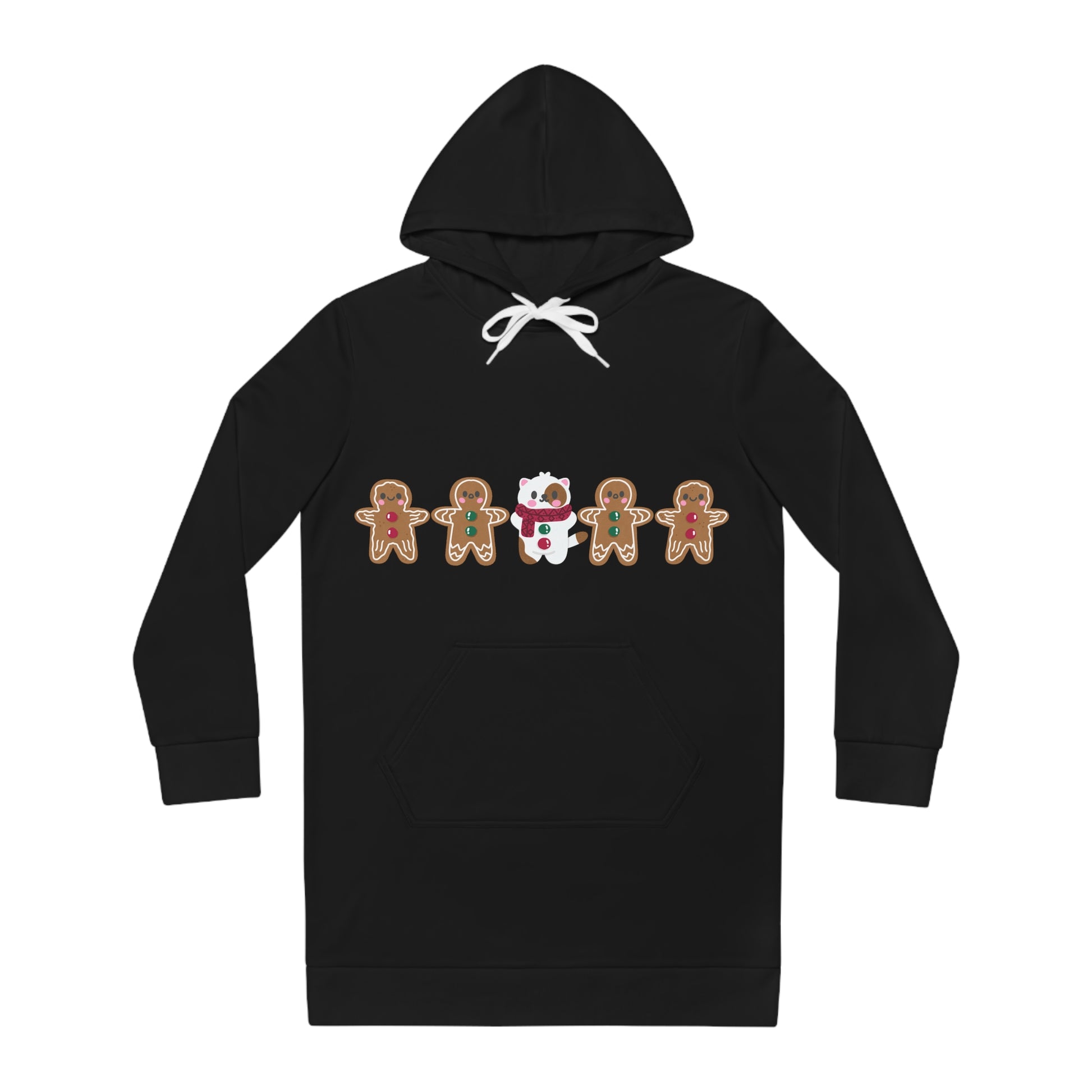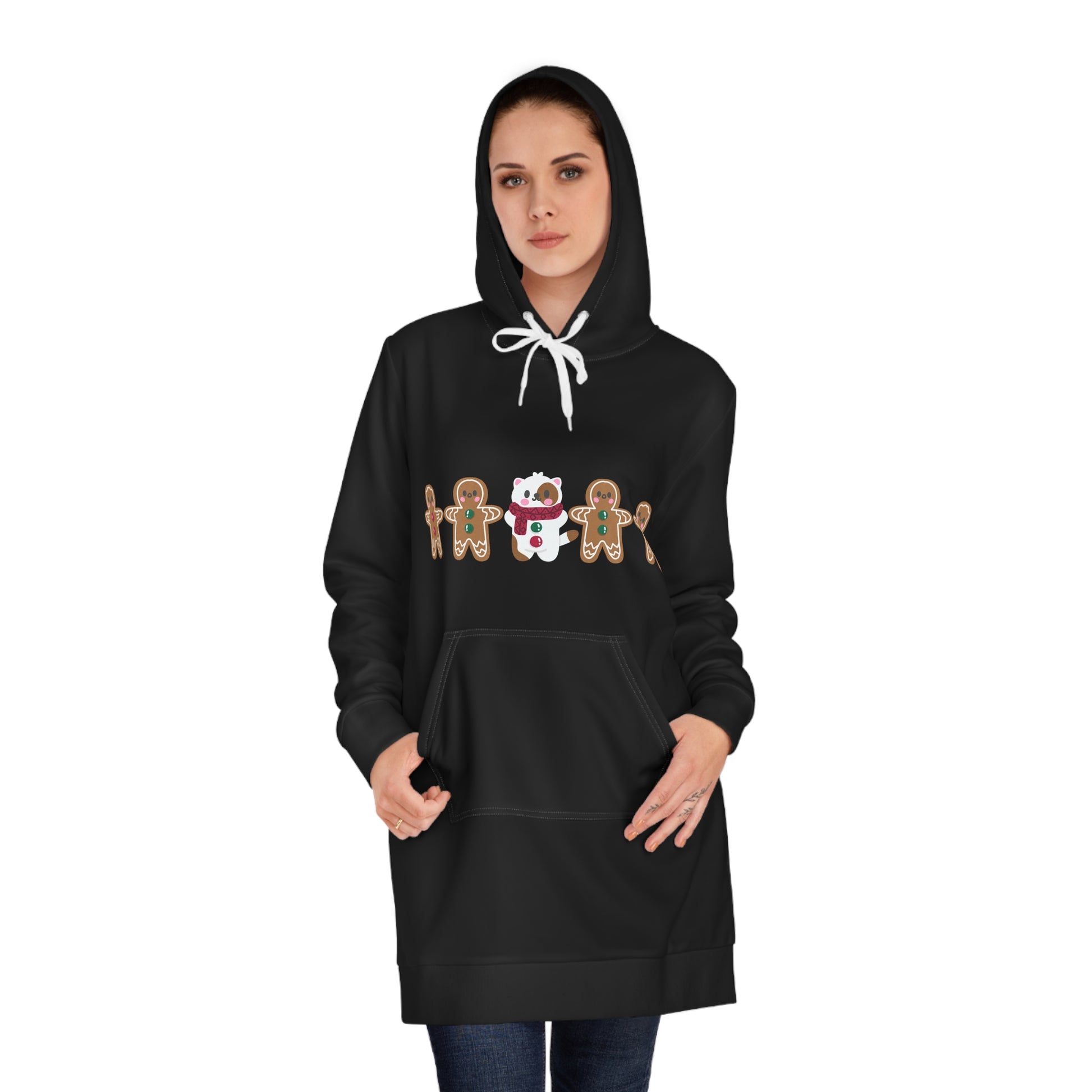 Wrap yourself in winter whimsy with our Whisker Wonderland women's hoodie dress, featuring an irresistibly cute cat holding hands with gingerbread men. This cozy polyester dress adds a touch of holiday charm to your wardrobe, ensuring both warmth and style on chilly days. The medium-heavy fabric and long hood provide the perfect blend of comfort and cuteness. Step into the season with this shiny-finished, regular-fit hoodie dress – where adorable meets festive fun.